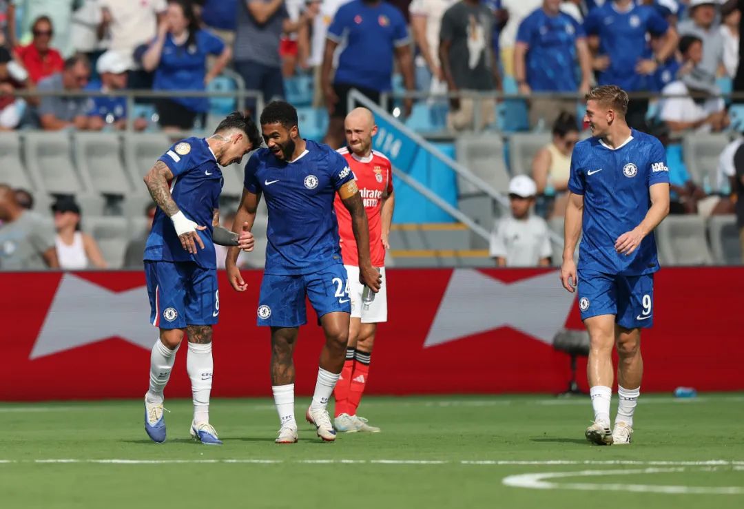 6月29日,切爾西隊球員里斯·詹姆斯(左二)進球后與隊友恩佐·費爾南德斯慶祝。新華社記者 李明 攝