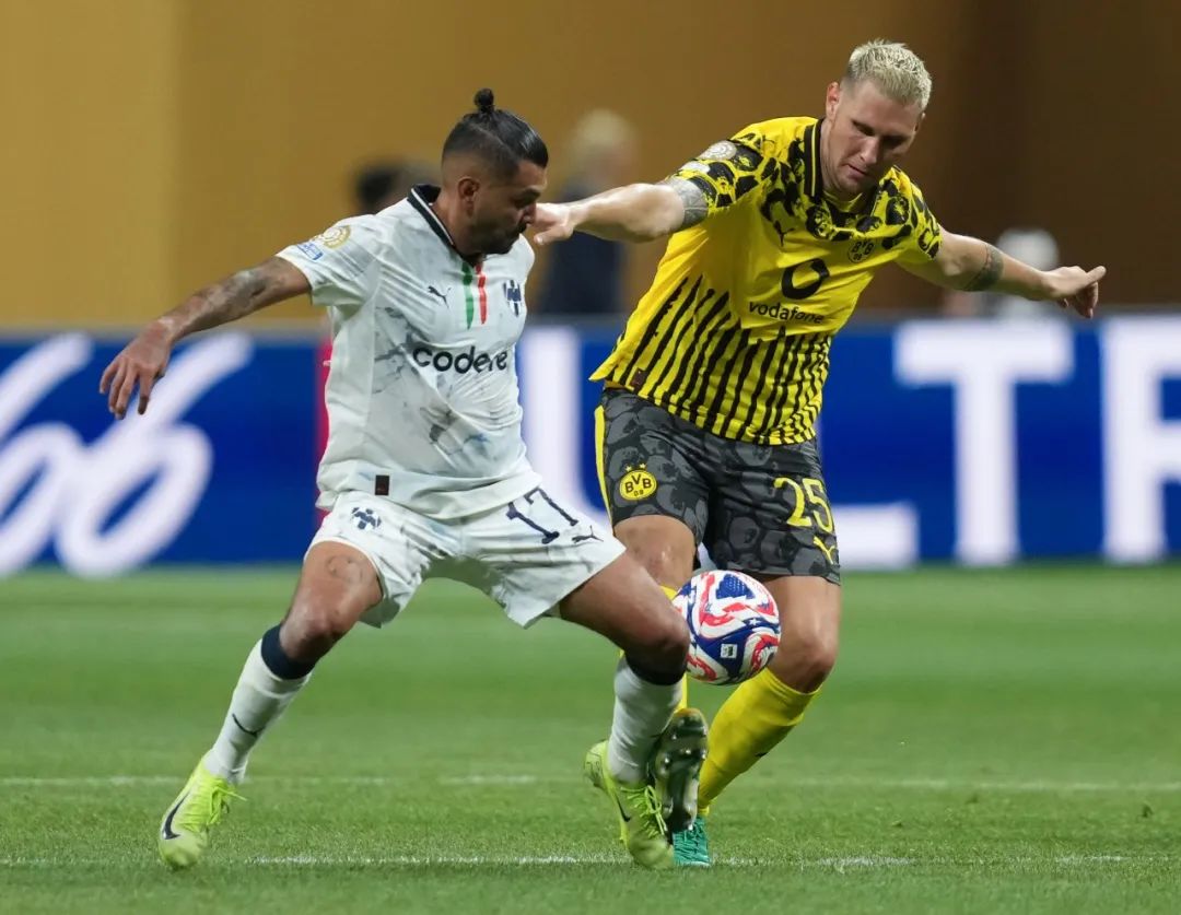 7月2日,蒙特雷隊赫蘇斯·科羅納(左)在比賽中拼搶。新華社記者 黃宗治 攝