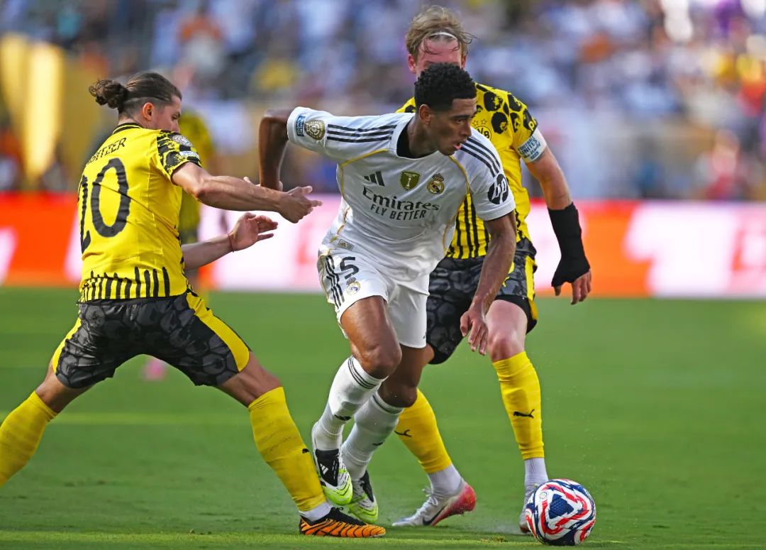 7月5日,皇家馬德里隊球員貝林厄姆(中)在比賽中帶球突破。新華社記者 李睿 攝