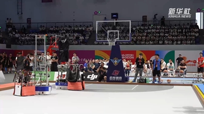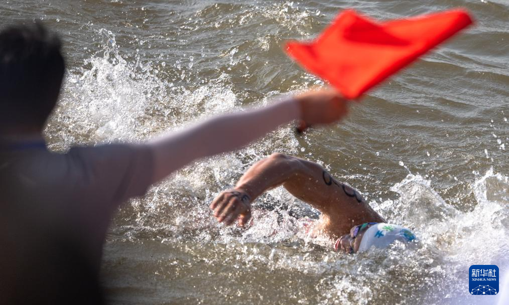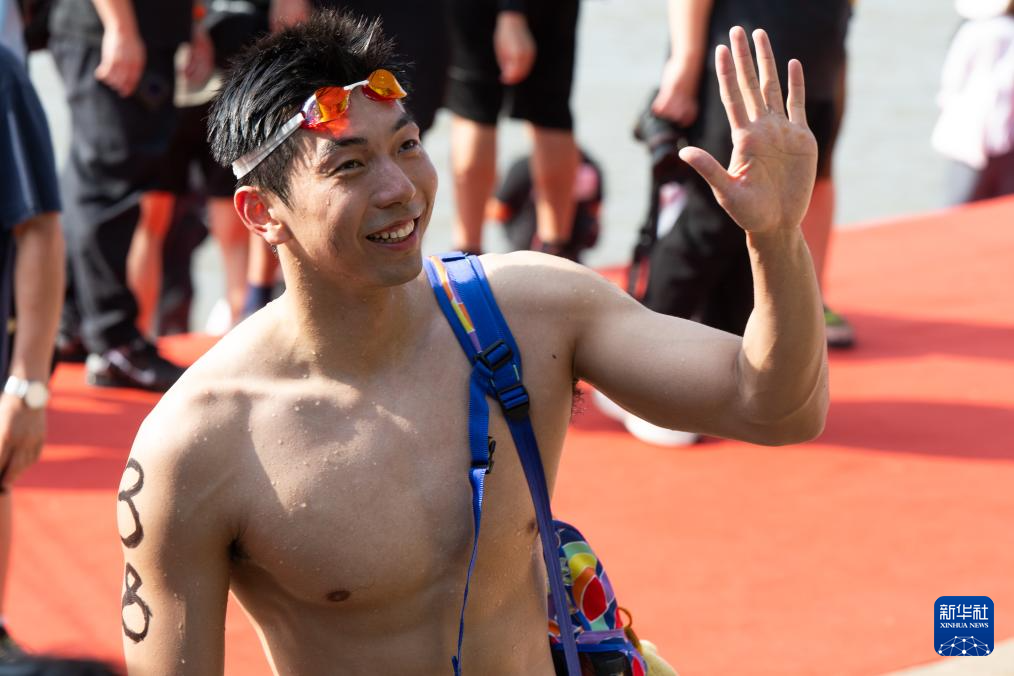 7月16日,參加男子搶渡賽的選手閆子貝登岸后向觀眾揮手致意。新華社記者 肖藝九 攝