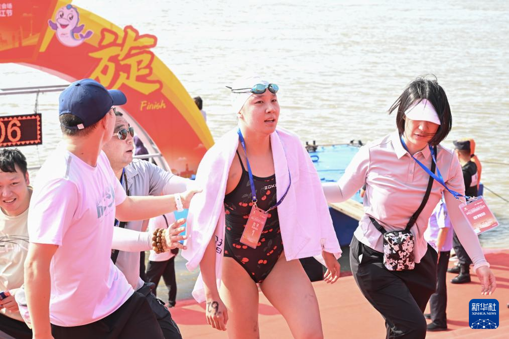 7月16日,參加女子搶渡賽的選手夏紫璇(中)在登岸后。最終,她以12分53秒15的成績獲得女子組冠軍。新華社記者 肖藝九 攝
