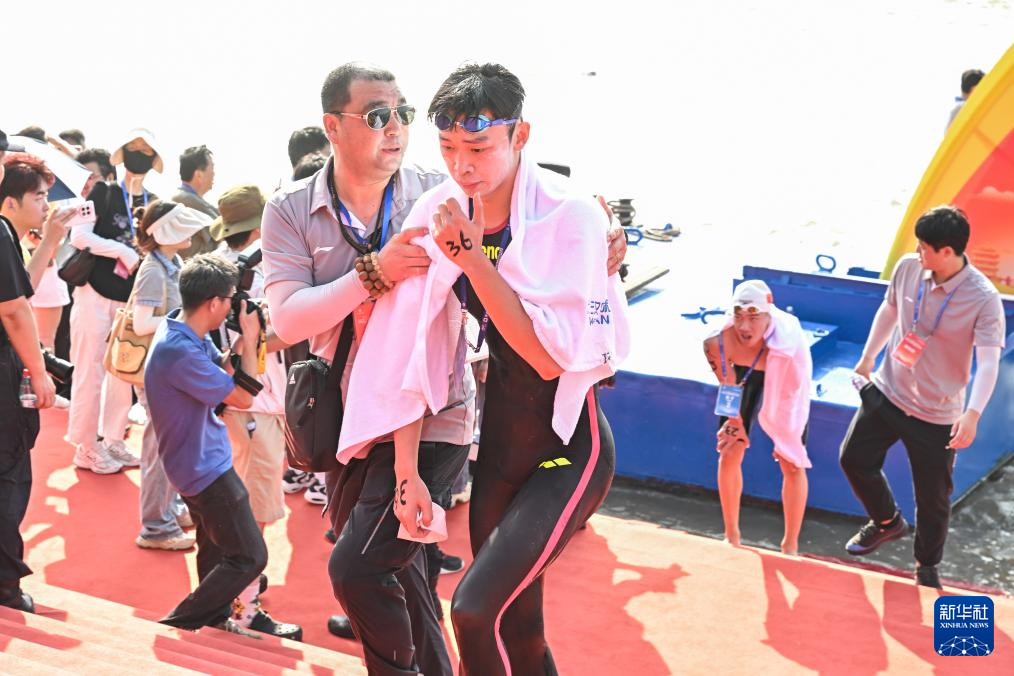 7月16日,參加男子搶渡賽的選手張子揚(中)在登岸后。最終,他以11分21秒06的成績獲得男子組冠軍。新華社記者 肖藝九 攝