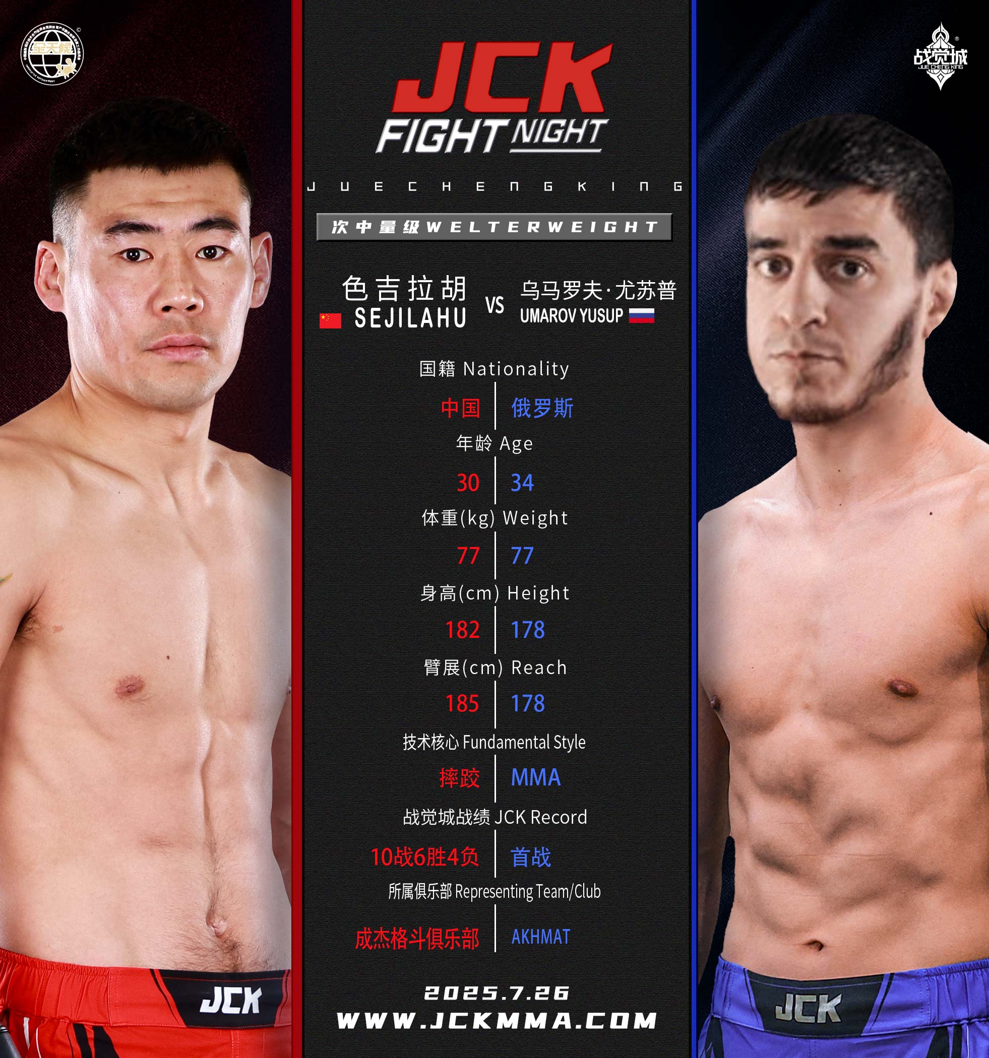 2025年7月26日,JCK覺城之夜N102將于JCK戰覺城國際格斗中心開戰,頭條主賽色吉拉胡VS烏馬羅夫·尤蘇普,聯合主賽加拉思·巴哈提汗VS王奇,正賽部分楊朝旭VS魯斯塔姆別克·努爾扎諾夫、羅周江措VS哈斯鐵爾·薩爾科特別克、特丹讓俄VS胡蘭·巴特爾艾力。