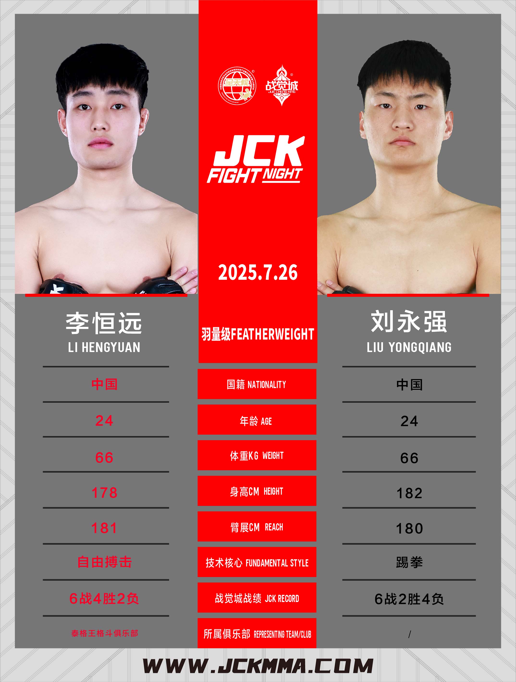 劉永強,JCK覺城之夜N76四人新銳賽冠軍,目前在JCK戰覺城6戰2勝,曾圈臂斷頭降服鐘振杰,手臂十字固降服肖銀鋒,目前3連敗。