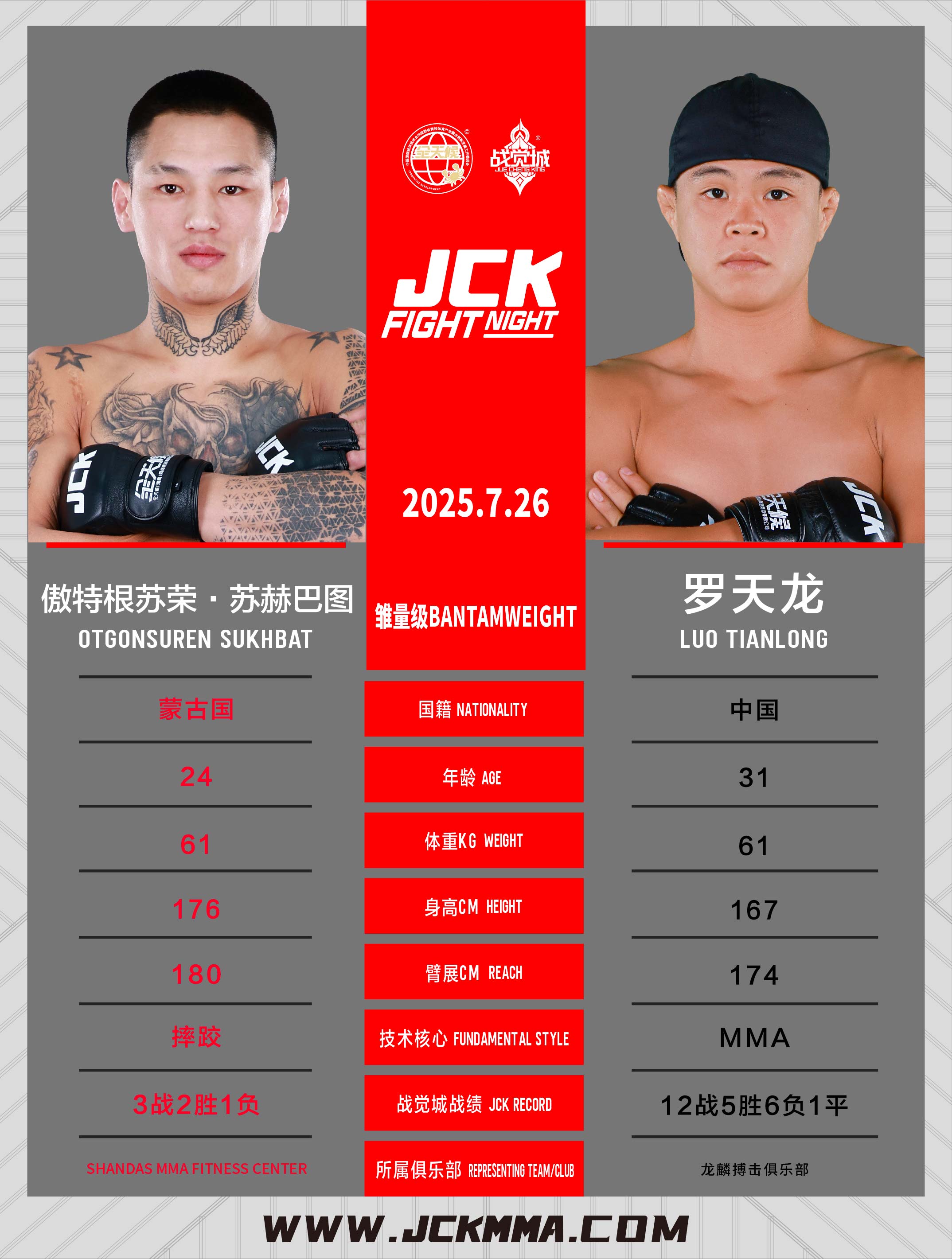 傲特根蘇榮·蘇赫巴圖,蒙古國選手,以摔跤為技術核心,目前在JCK戰覺城3戰2勝,且兩場勝場均為首回合終結,分別TKO努爾加那提·朱馬依、背后裸絞降服葉爾波勒·塔加力克。