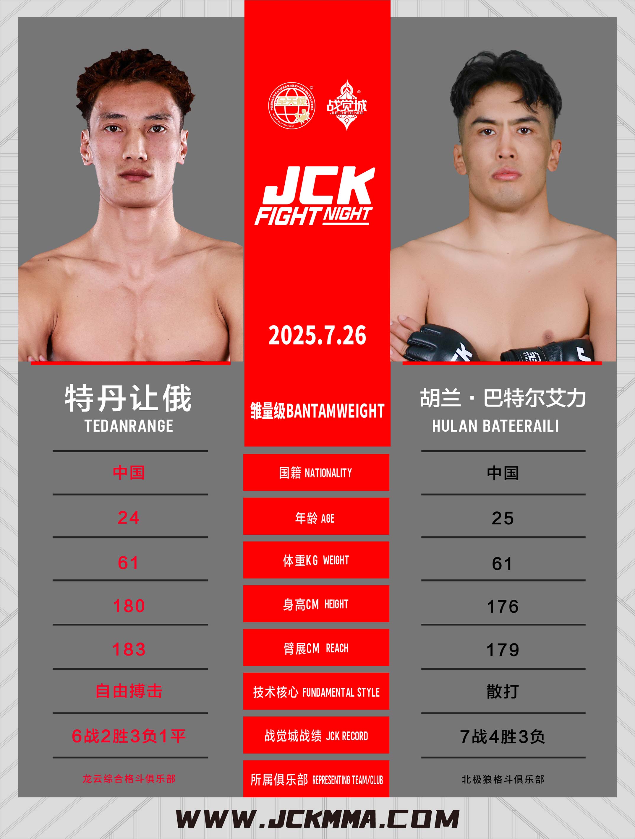 胡蘭·巴特爾艾力,技術核心散打,這位簽約選手目前在JCK戰覺城7戰4勝,曾TKO陳孚、阿育木呷,一致判定戰勝任治豪,達斯斷頭降服白濤。