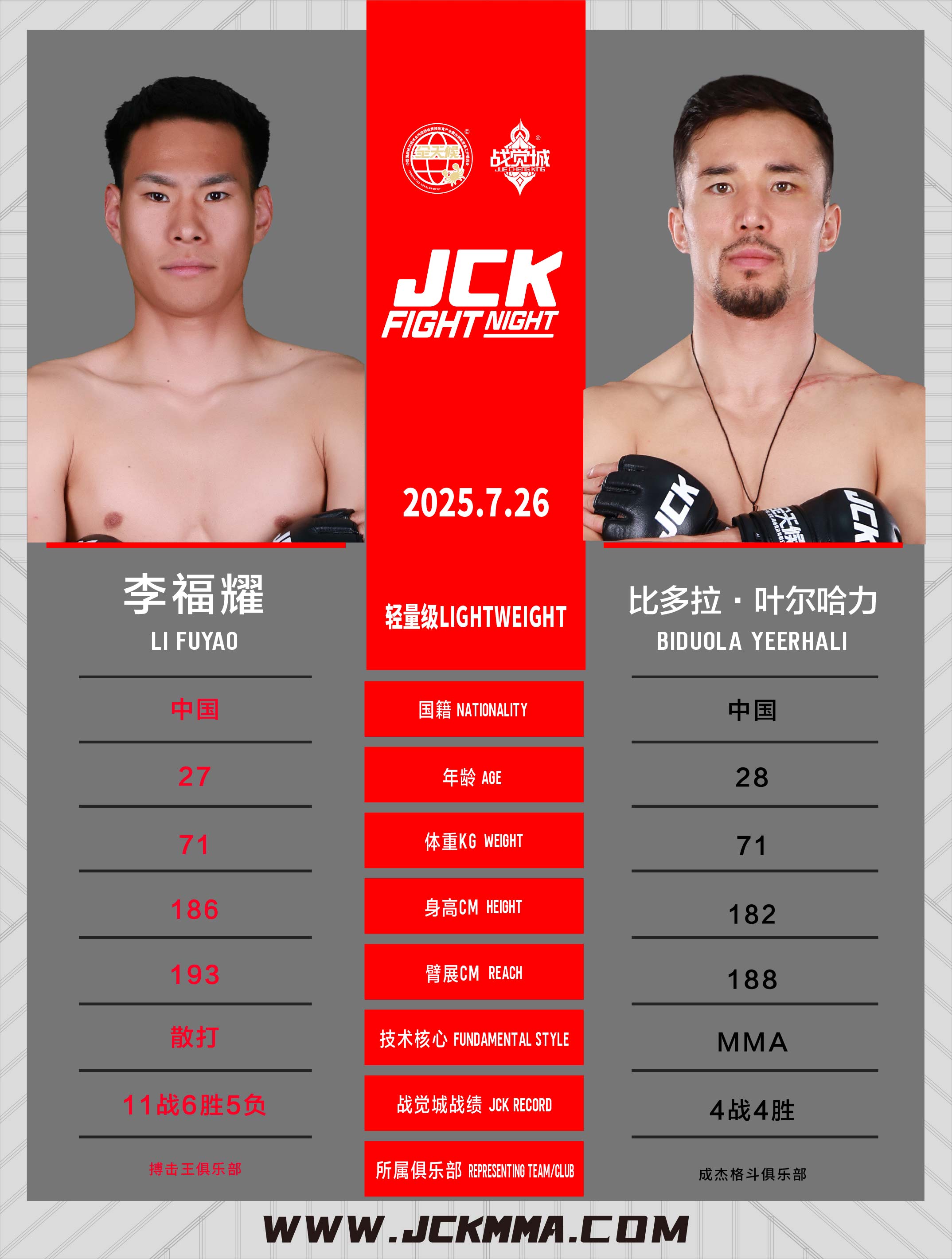 比多拉·葉爾哈力,在JCK戰覺城4戰4勝,曾背后裸絞降服烏日根巴雅爾、趙炅義,TKO??′?、葉爾達吾列提·阿亞提,他在JCK戰覺城的4場勝場均首回合終結。