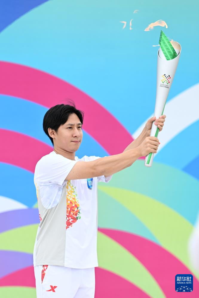 7月26日,火炬手胡荷韜在傳遞火炬。