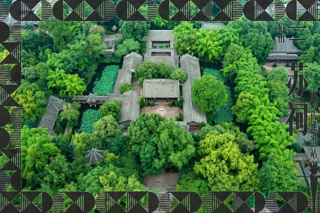 ↑這是無人機拍攝的眉山三蘇祠內的東坡盤陀坐像(上)和披風榭(2022年6月22日攝)。新華社記者 沈伯韓 攝