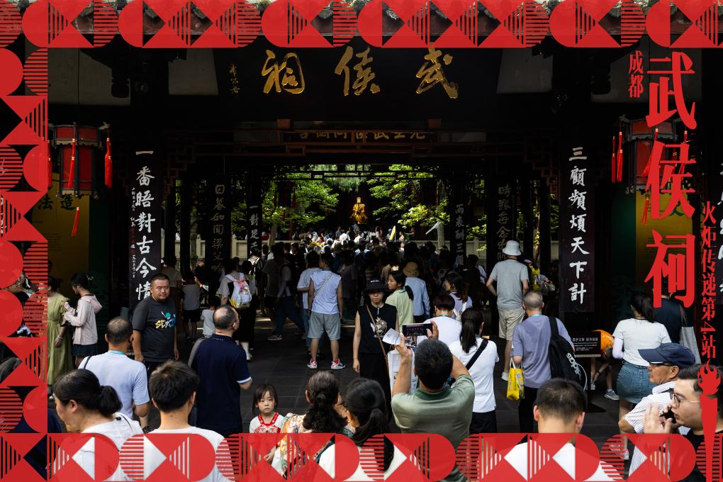 ↑2025年7月26日,火炬手鄧雅文(左)和吳丹在武侯祠博物館傳遞火炬。新華社記者 孫非 攝