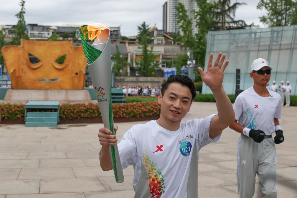 ↑2025年7月26日,火炬手鄒敬園在金沙遺址博物館傳遞火炬。新華社記者 陳誠 攝