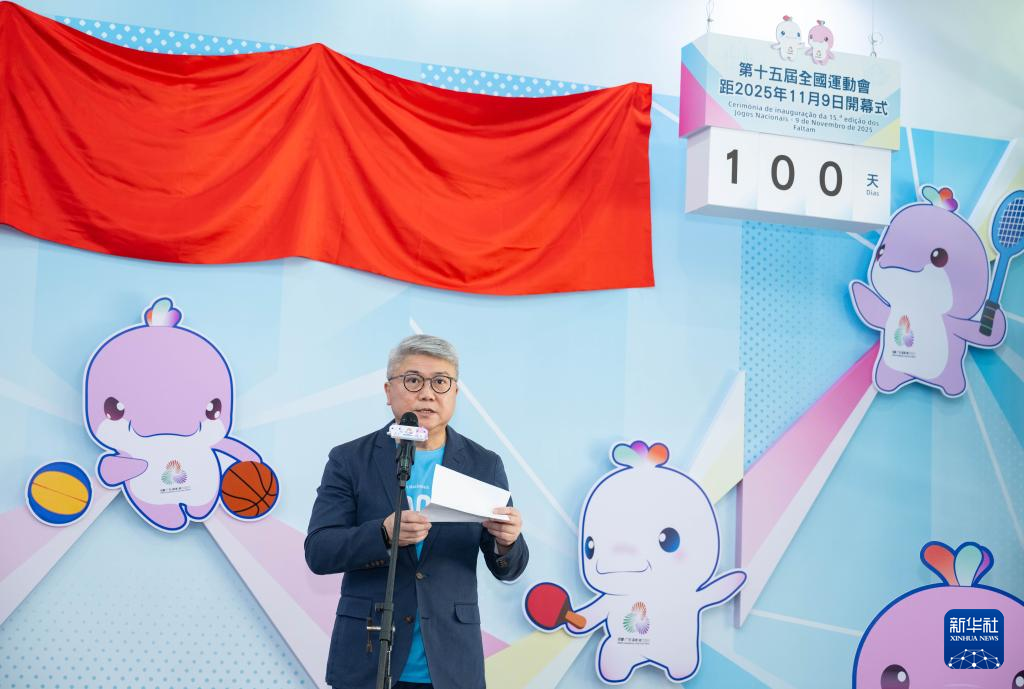 8月1日,第十五屆全運會及第九屆殘特奧會澳門賽區組織委員會秘書長、籌備辦公室主任潘永權在投運儀式上致辭。新華社發(張金加攝)