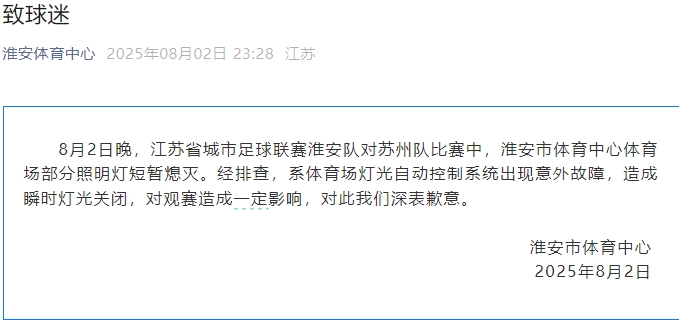 淮安主場發生“滅燈”意外,全場觀眾點亮手機屏幕