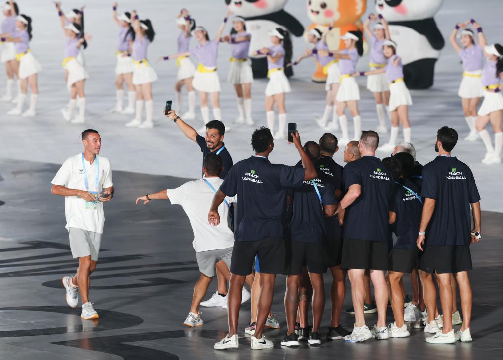 8月7日,巴西體育代表團成員在開幕式現場自拍留念。 新華社記者 姜克紅 攝