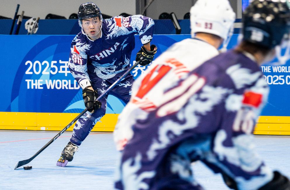 8月7日,中國隊選手胡文瀚(左一)在成都世運會單排輪滑球男子A組預賽中。新華社記者 謝劍飛 攝