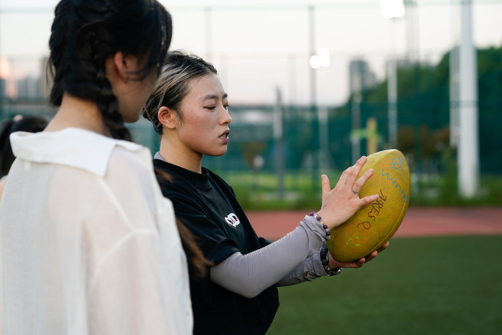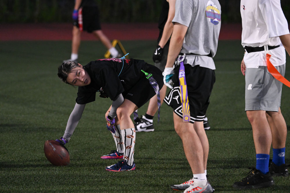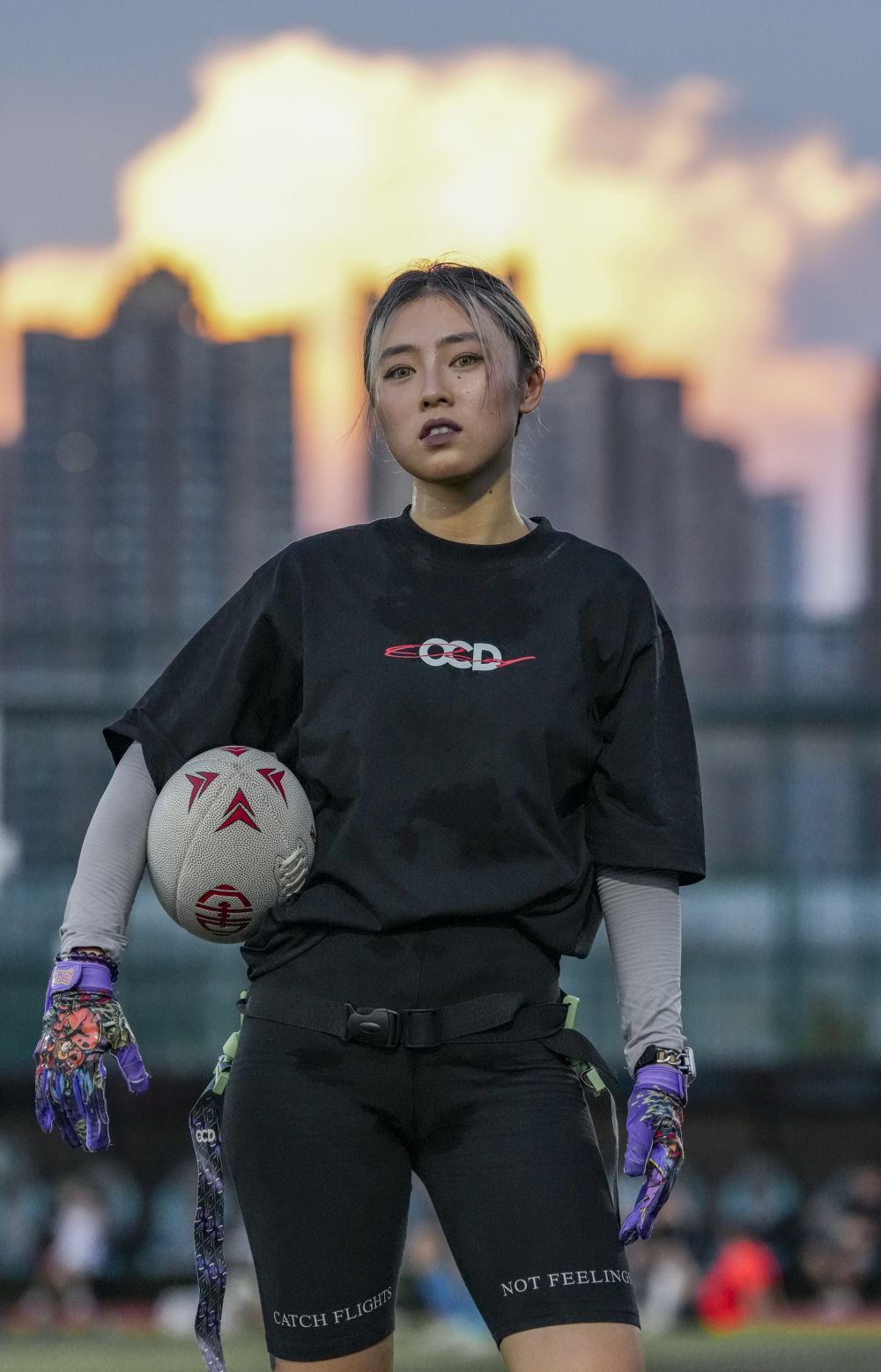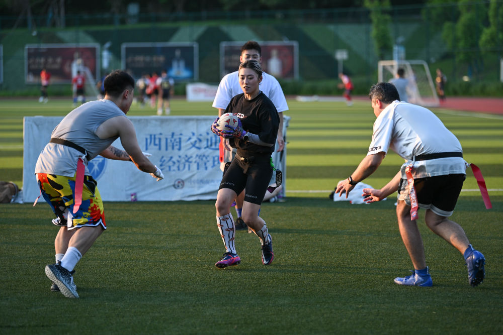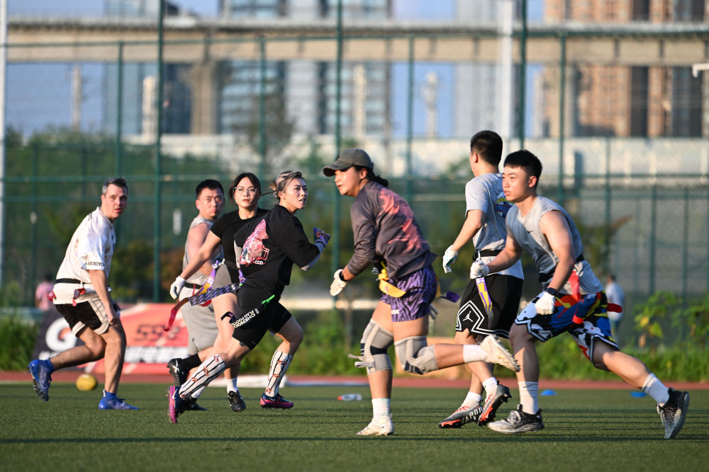 ↑在成都一處運動場,腰旗橄欖球愛好者在進行比賽(2025年3月8日攝,無人機照片)。