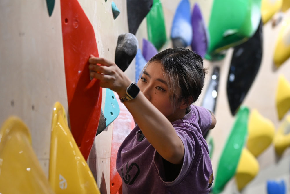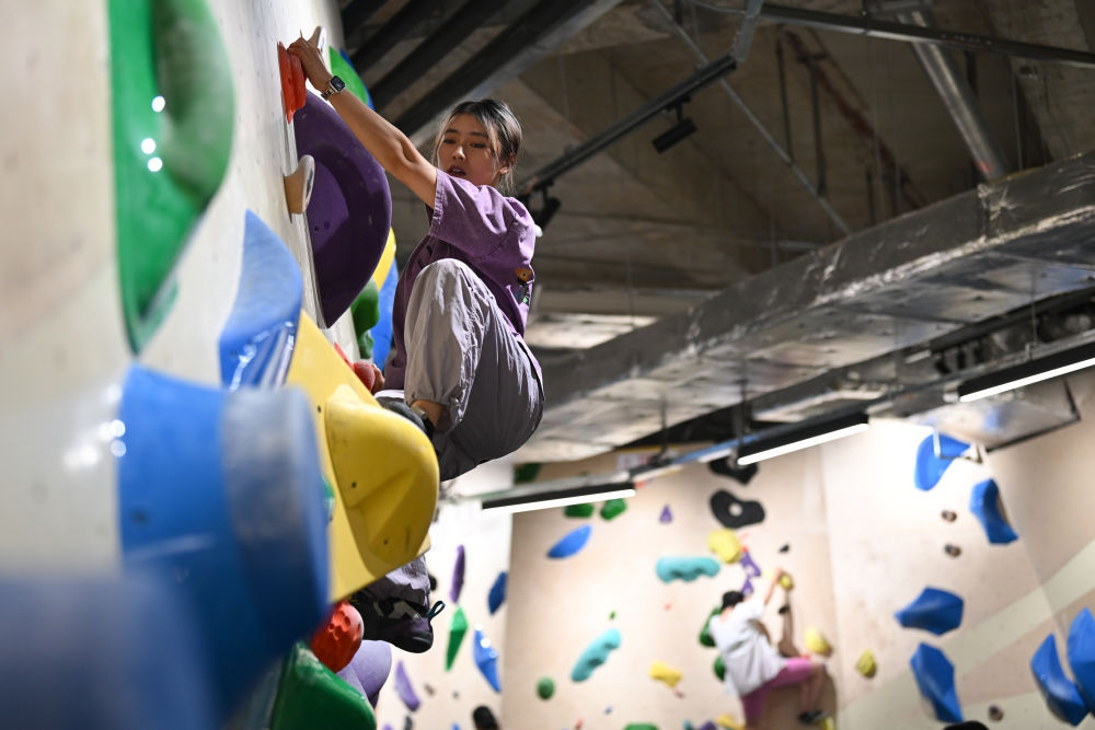 ↑在成都一家攀巖館內,教練在指導孩子們攀巖技巧(2024年7月15日攝)。