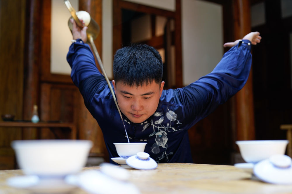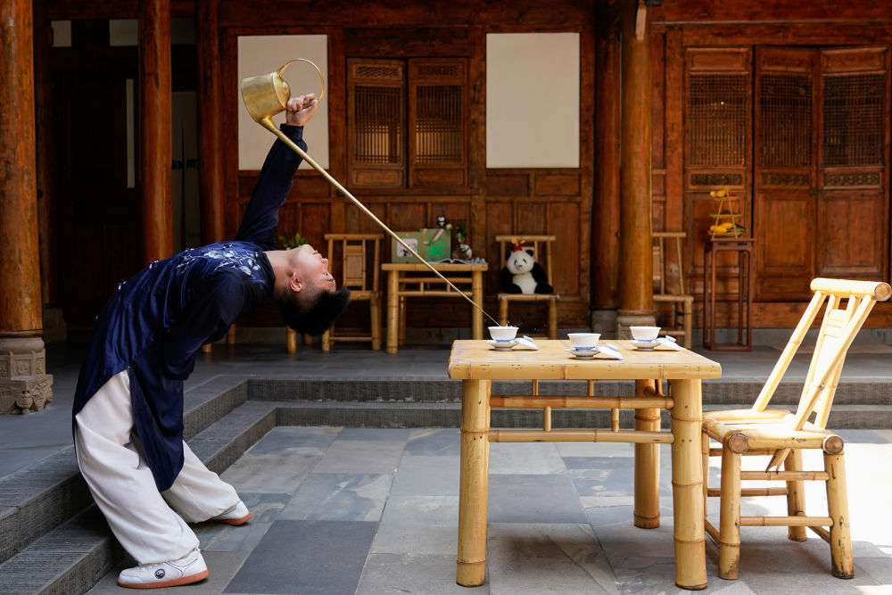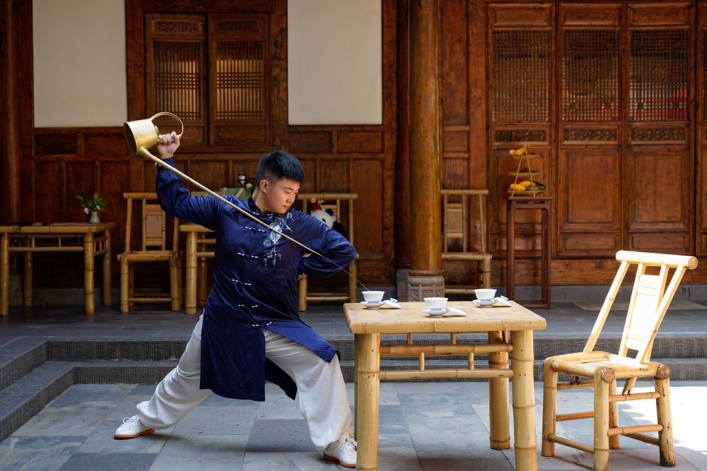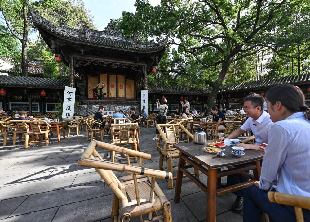↑在成都鐵像寺水街,游客體驗蓋碗茶(2023年7月14日攝)。