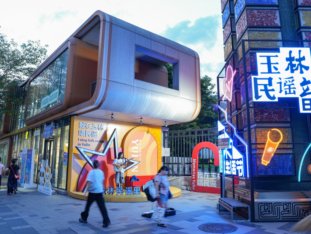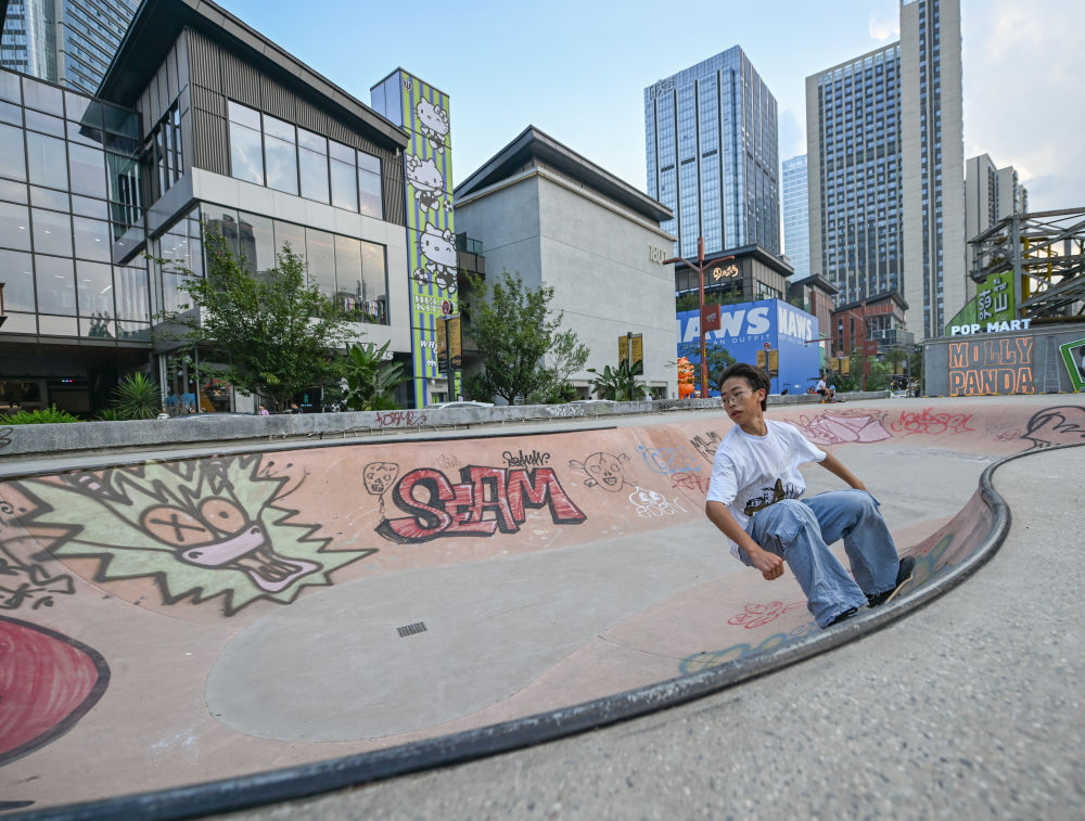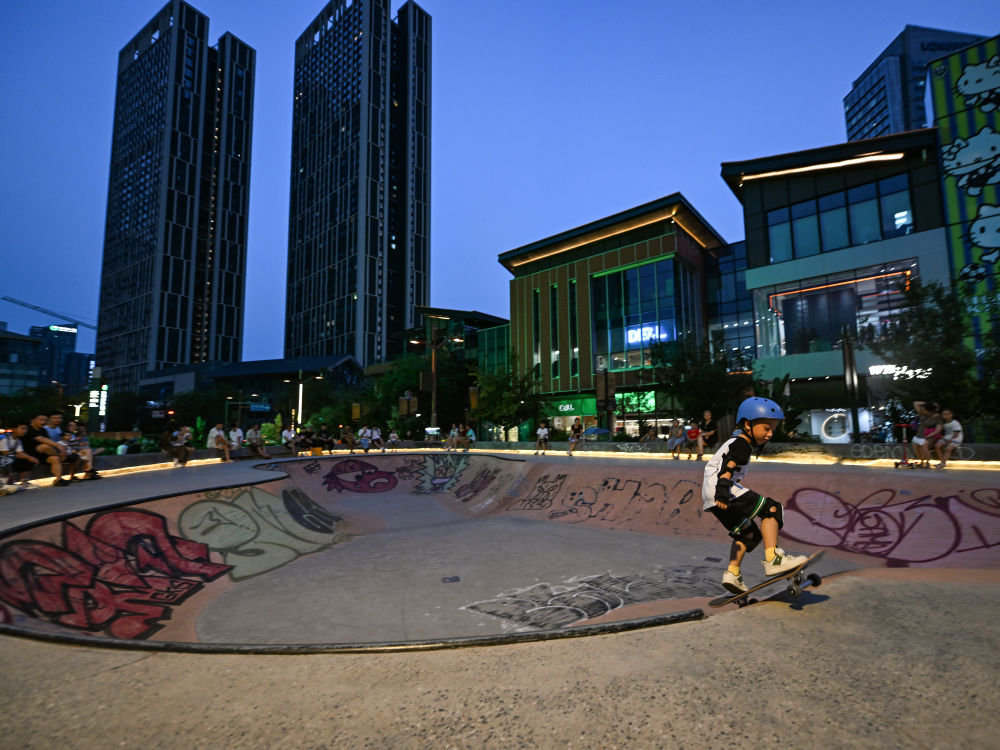 ↑在成都鐵像寺水街,一位母親帶著兒子在玩滑板(2023年7月14日攝)。
