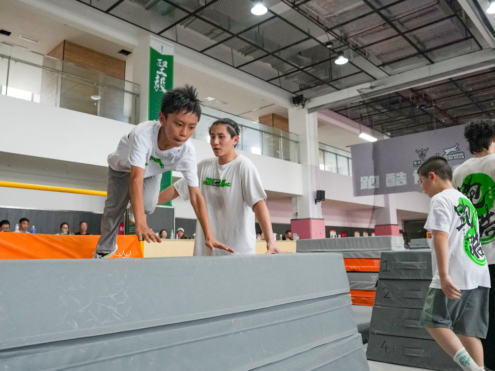 ↑在成都一家跑酷訓練基地,青少年在練習跑酷(2025年8月5日攝)。