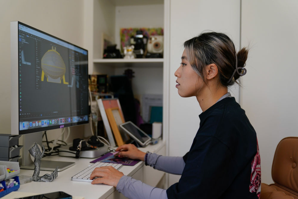 ↑吳慶文展示自己設計的攀巖文創掛件(7月27日攝)。