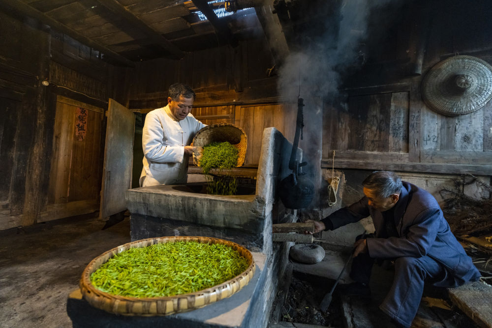 ↑制茶師(左)在雅安市蒙頂山制作綠茶(2022年3月31日攝)。
