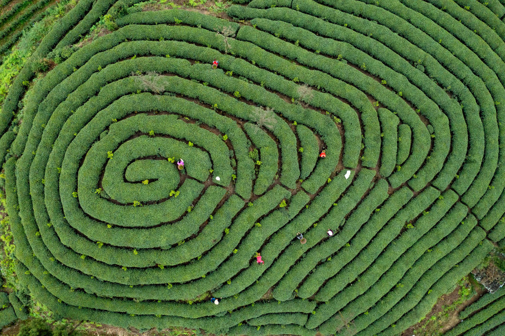↑茶農在雅安市蒙頂山上的茶園采摘茶青(2025年3月30日攝,無人機照片)。
