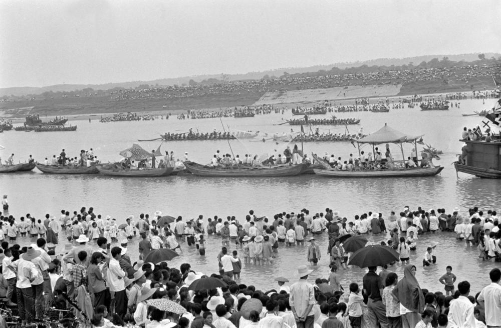 ↑在湖南省汨羅江上,群眾們觀看龍舟競賽(1981年6月6日攝)。位于汨羅江畔的湖南汨羅因屈原而聞名,也被稱為“龍舟故里”。