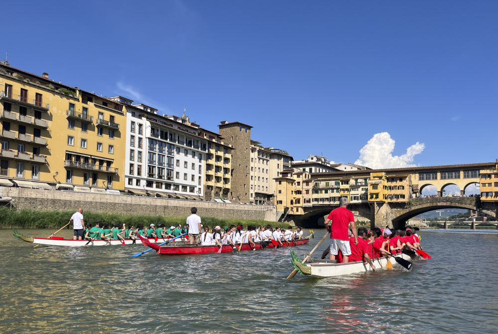 ↑在意大利佛羅倫薩,選手們在阿諾河上參加龍舟比賽(2025年5月31日攝)。
