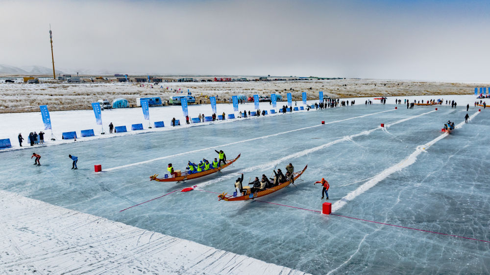 ↑在新疆博爾塔拉蒙古自治州,選手們參加“首屆賽里木湖全國冰上龍舟邀請賽”(2025年3月15日攝,無人機照片)。