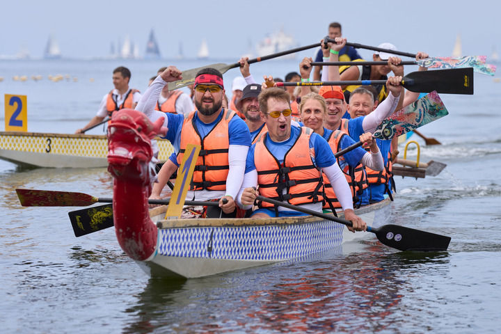 ↑在俄羅斯符拉迪沃斯托克,選手為獲得龍舟比賽勝利歡呼(2025年6月29日攝)。