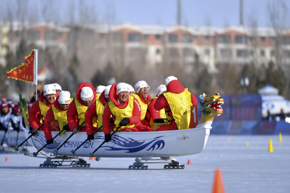 ↑在內蒙古自治區錫林郭勒盟舉行的第十四屆全國冬季運動會群眾體育冰上龍舟項目中,冠軍內蒙古隊在男子組(12人)龍舟200米直道賽決賽中(2020年1月12日攝)。