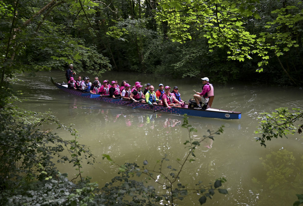 ↑在法國香檳沙隆,“冠軍龍女”龍舟隊在馬恩河上訓練(2024年7月7日攝)。