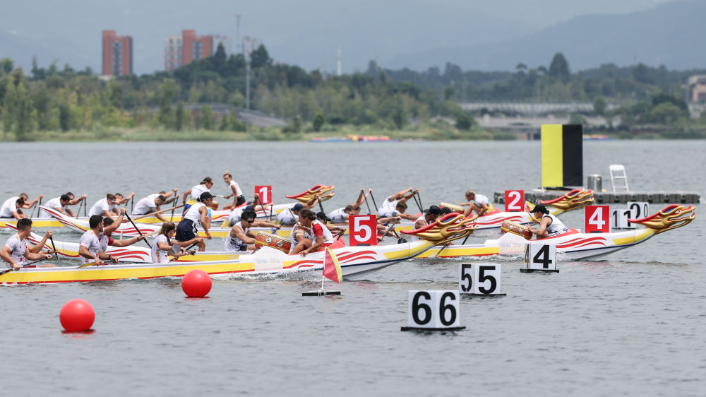 ↑在成都興隆湖湖濱賽場,選手們在2025年成都世運會龍舟8人座公開組200米半決賽比賽中(8月9日攝)。