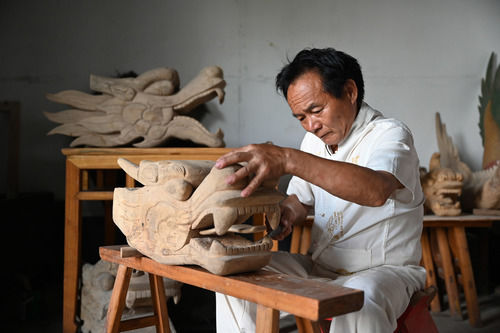 ↑湖南省汨羅市屈子祠鎮九子龍屈原龍舟廠內,許桂生正在雕制龍頭(2020年6月13日攝)。