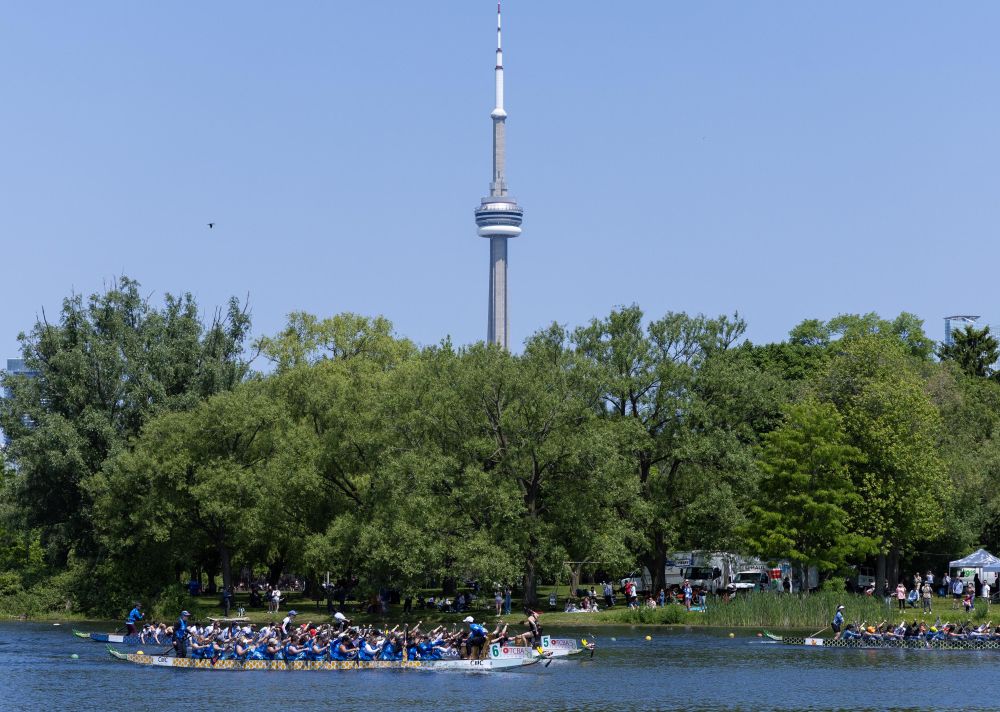 ↑在加拿大多倫多,選手們在2025年國際龍舟節上競渡(2025年6月14日攝)。