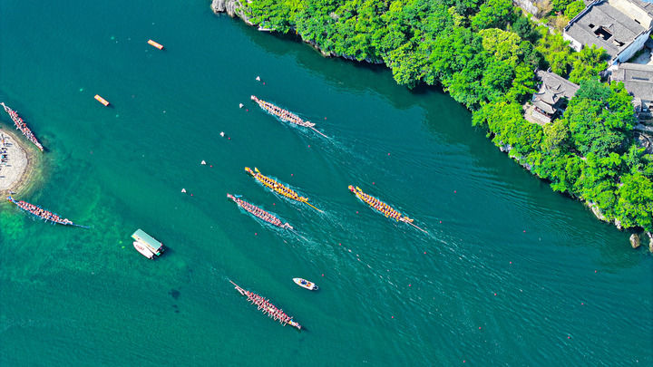 ↑在安徽省宣城市涇縣桃花潭鎮,數支龍舟隊在參與當地舉辦的龍舟賽,迎接端午節的到來(2025年5月30日攝,無人機照片)。