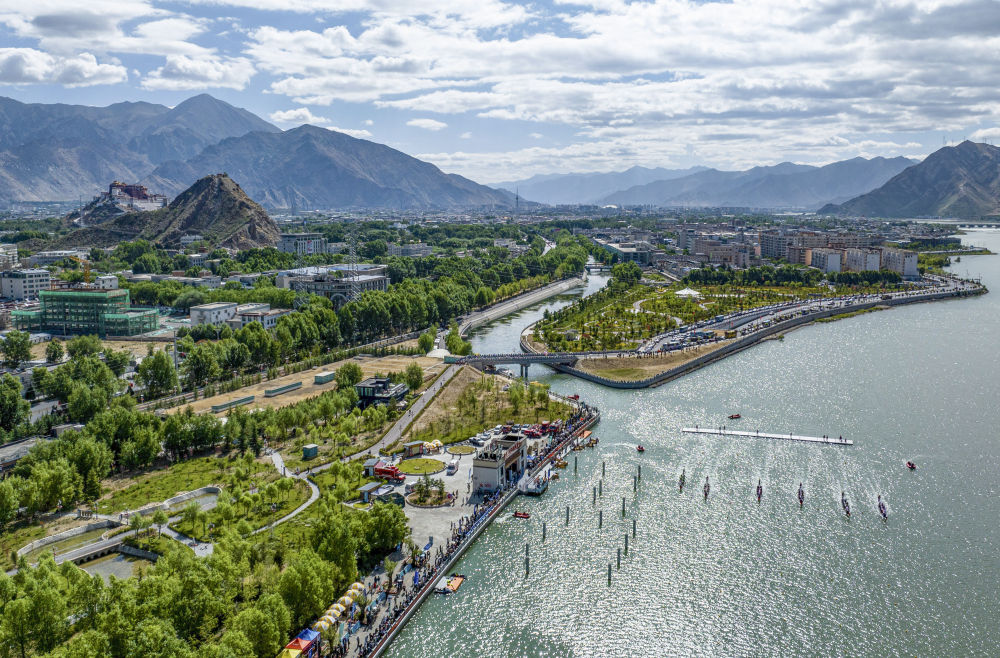 ↑在西藏自治區拉薩市,參賽隊伍在“2024年西藏自治區端午節牛皮船(龍舟)賽”中(2024年6月9日攝,無人機照片)。
