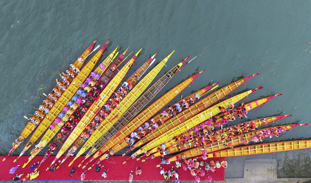 ↑四川省閬中市,參賽龍舟在嘉陵江畔集結(2025年5月31日,無人機照片)。