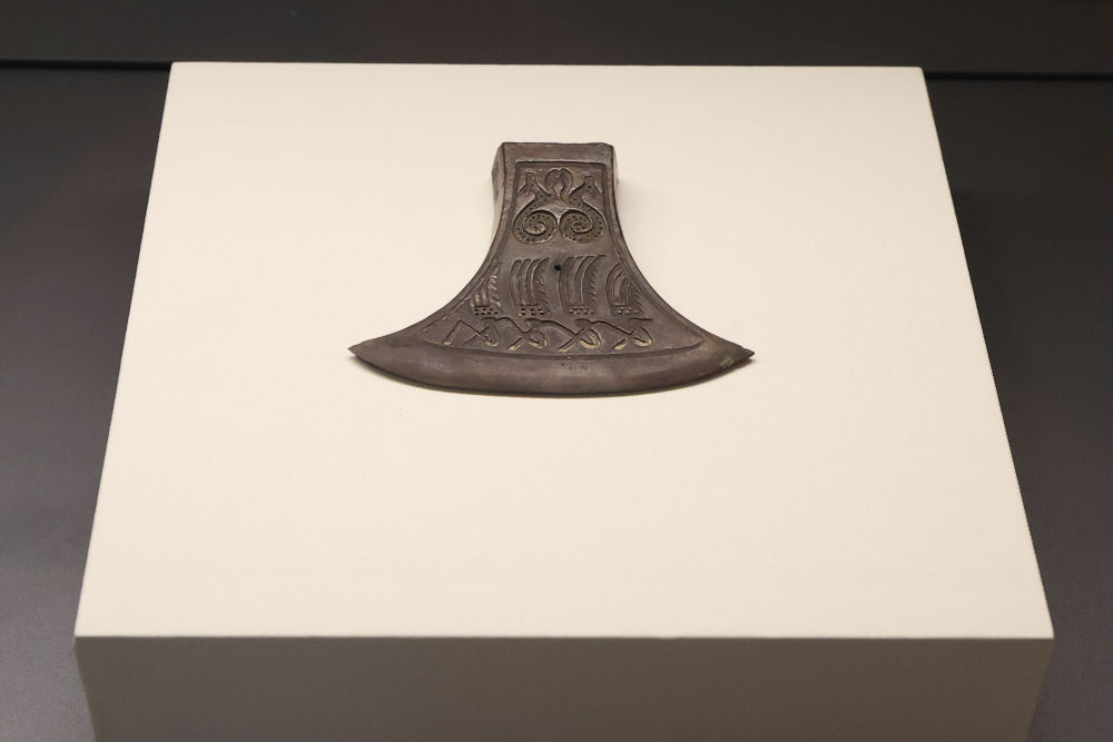 ↑圖為“羽人競渡紋銅鉞”(復制品)。