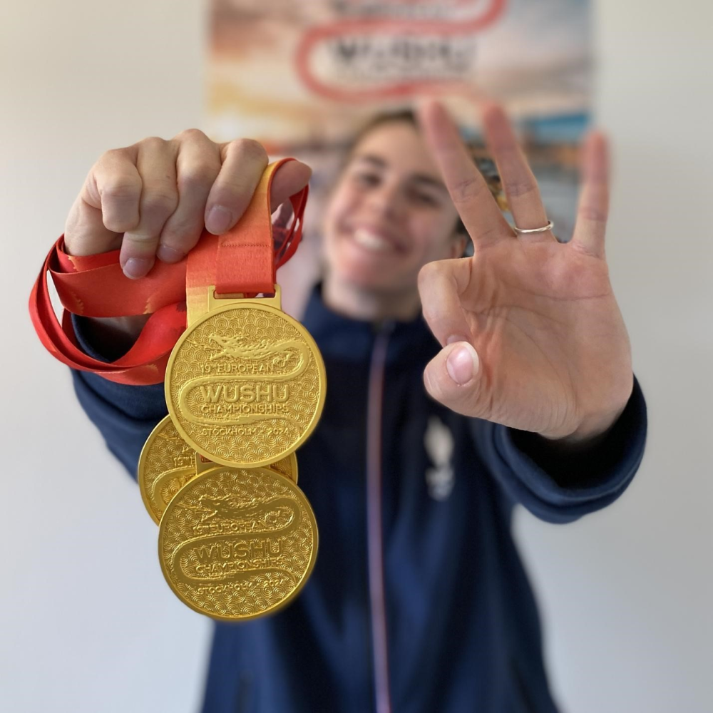 朱麗葉展示在歐洲武術錦標賽上獲得的金牌。受訪者供圖