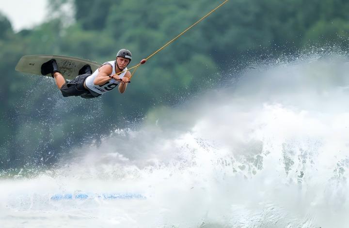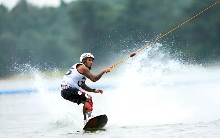 8月9日,中國選手張偉在男子索道滑水復活賽中。新華社記者 貝赫 攝