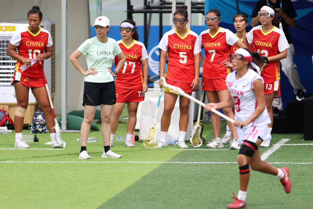 8月8日,中國隊教練莫棋雯(左二)在場邊觀看比賽。當日,在成都世運會女子棍網球A組預賽中,中國隊對陣日本隊。新華社記者 陳斌 攝