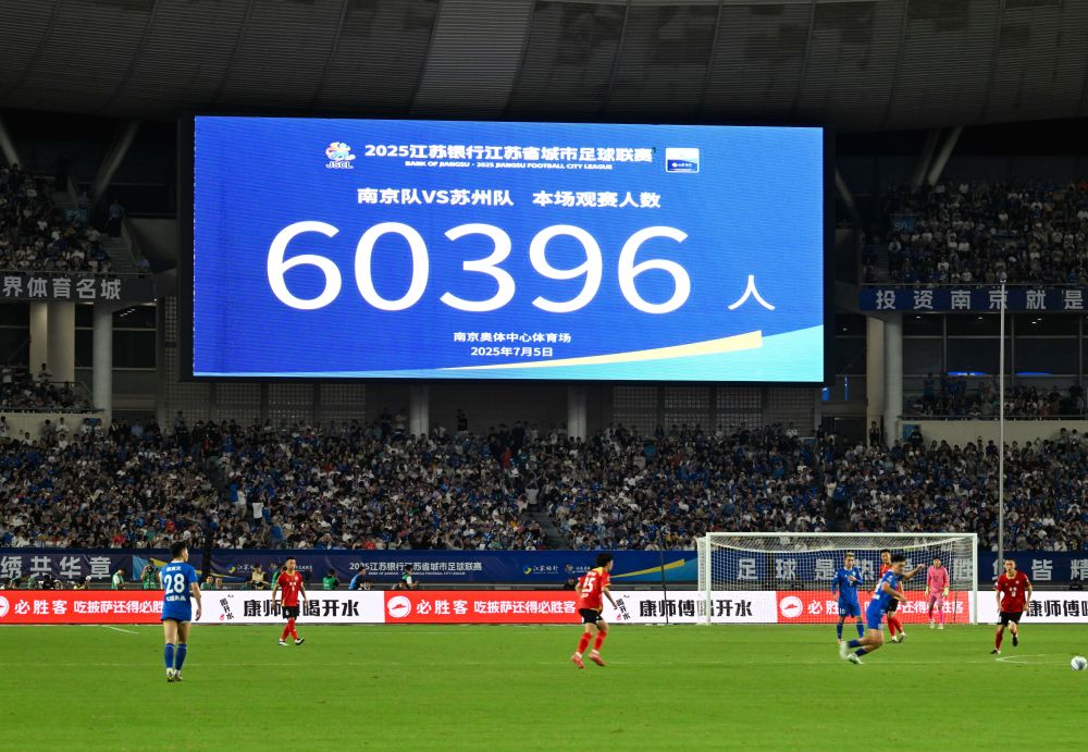 7月5日,在江蘇南京舉行的江蘇省城市足球聯賽第六輪比賽中,南京隊主場0:0戰平蘇州隊。球場大屏顯示本場比賽共有60396名觀眾到場觀賽,打破“蘇超”單場上座紀錄。新華社記者 季春鵬 攝