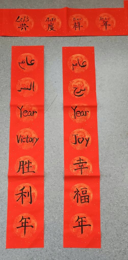 麥哈尼(前)正在用阿拉伯語寫春聯。受訪者供圖