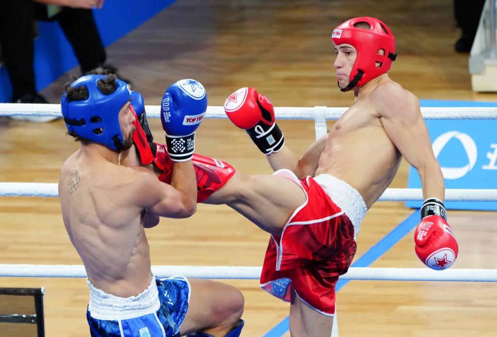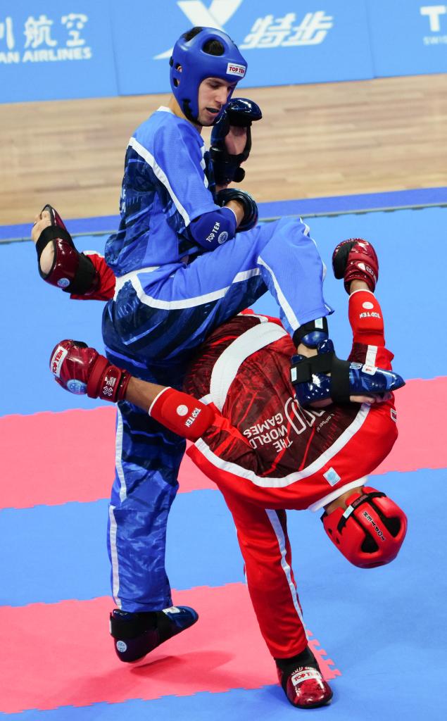 8月13日,奧地利選手齊默爾曼(上)與荷蘭選手布爾克在自由搏擊男子半接觸74公斤級半決賽比賽中。新華社記者 陳欣波 攝