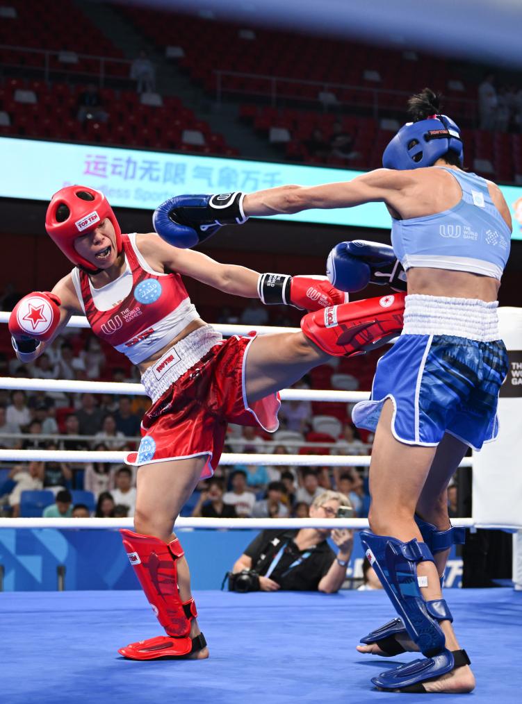 8月12日,中國選手耿春蕾(左)在自由搏擊女子K1 52公斤級四分之一決賽比賽中。新華社記者 張博文 攝