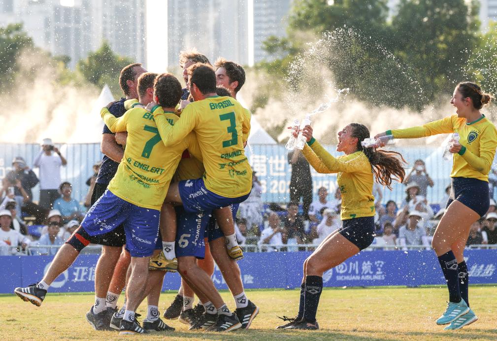 8月13日,巴西女子浮士德球隊球員在賽后進入場內共同慶祝。新華社記者 陳誠 攝