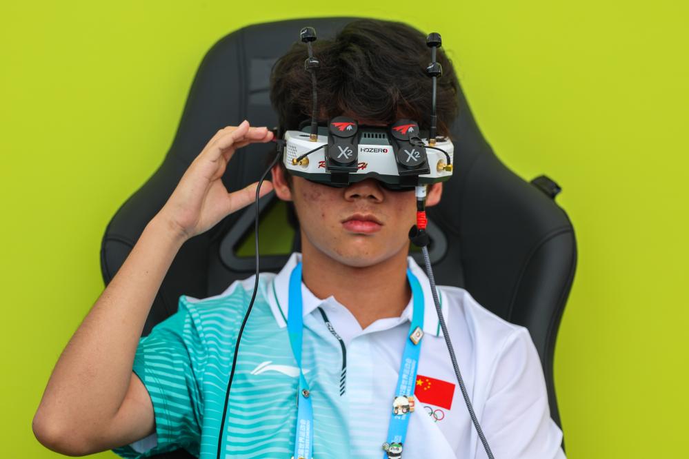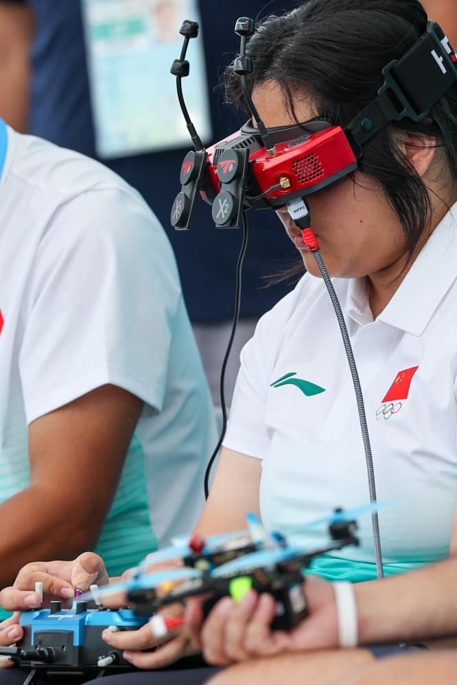 8月14日,中國選手黃悅祺在無人機競速資格賽第二輪比賽前進行準備。新華社記者 李博 攝