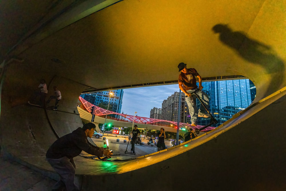 ↑2024年10月26日,愛好者在交子大道玩滑板車。新華社發